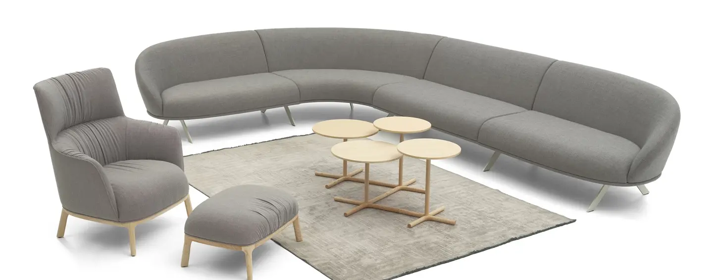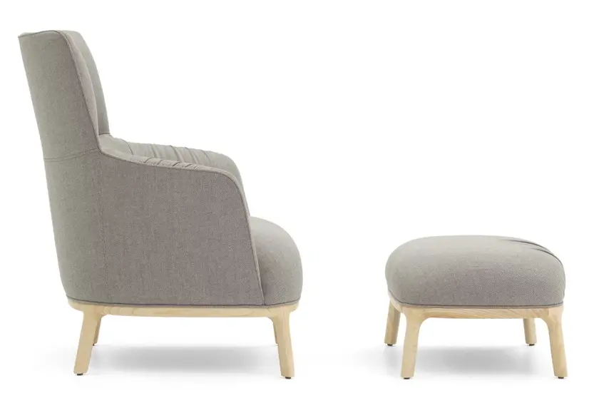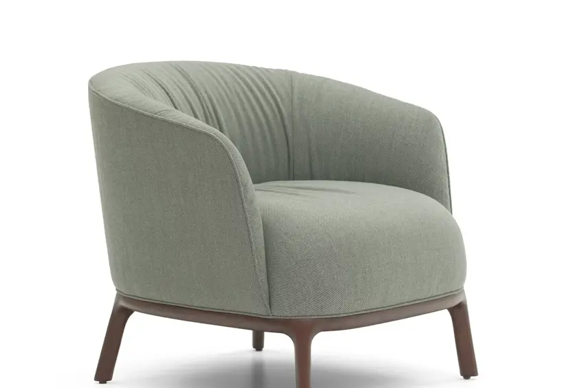 Bambi is a lounge chair designed for relaxation, featuring soft, curvaceous lines and generous proportions. Upholstered in luxurious fabric or leather, it offers enveloping comfort in a range of colors. The wide, gently curved seat and versatile backrest, available in both high and low options, ensure exceptional support. Artisanal details, such as thin visible stitching and the natural wood base, add a refined touch.