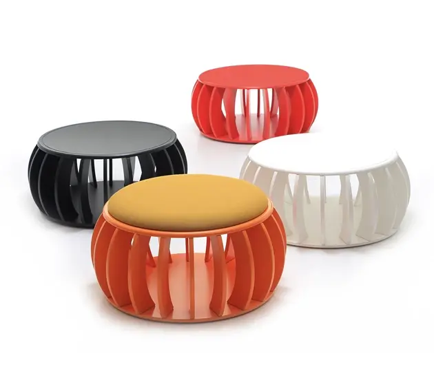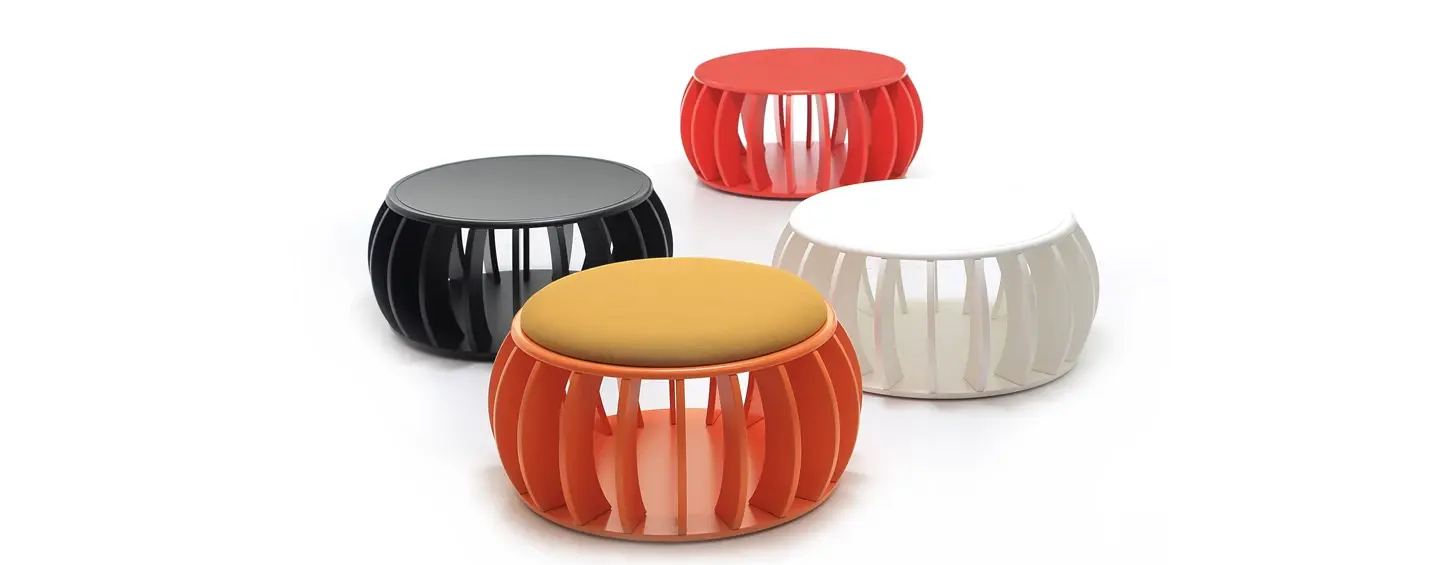 C-Anenome is a breakout stool and coffee table concept designed by David Fox. Inspired by a sea anemone, our idea was to make a product using entirely CNC cut wood components. We figured C-Anenome as upholstered and un-upholstered versions for multiple uses. It can be finished in a number of colors, with complementary contract fabrics and leathers for the seat.