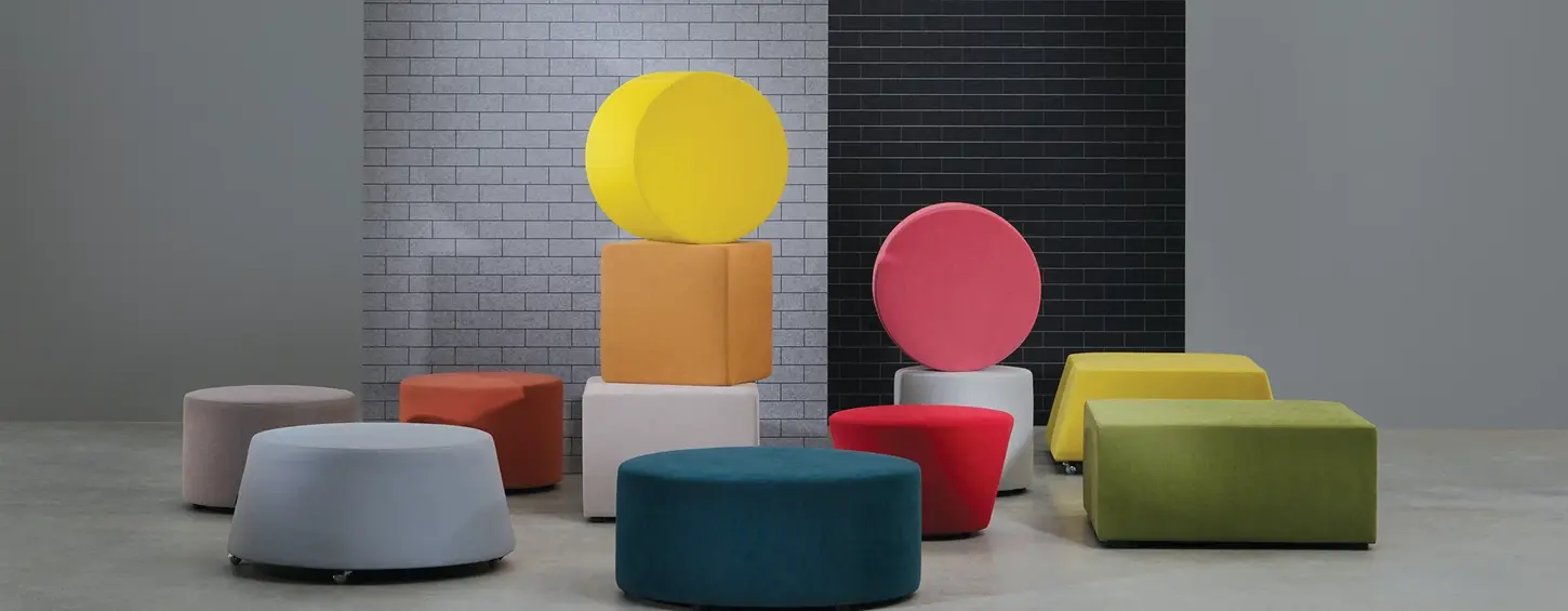 Basic cubic and circular shapes blend with almost any architectural environment. Moda has been designed for both homes and public spaces. The bicolor fabric combination facilitates adaptability to different ambiances.