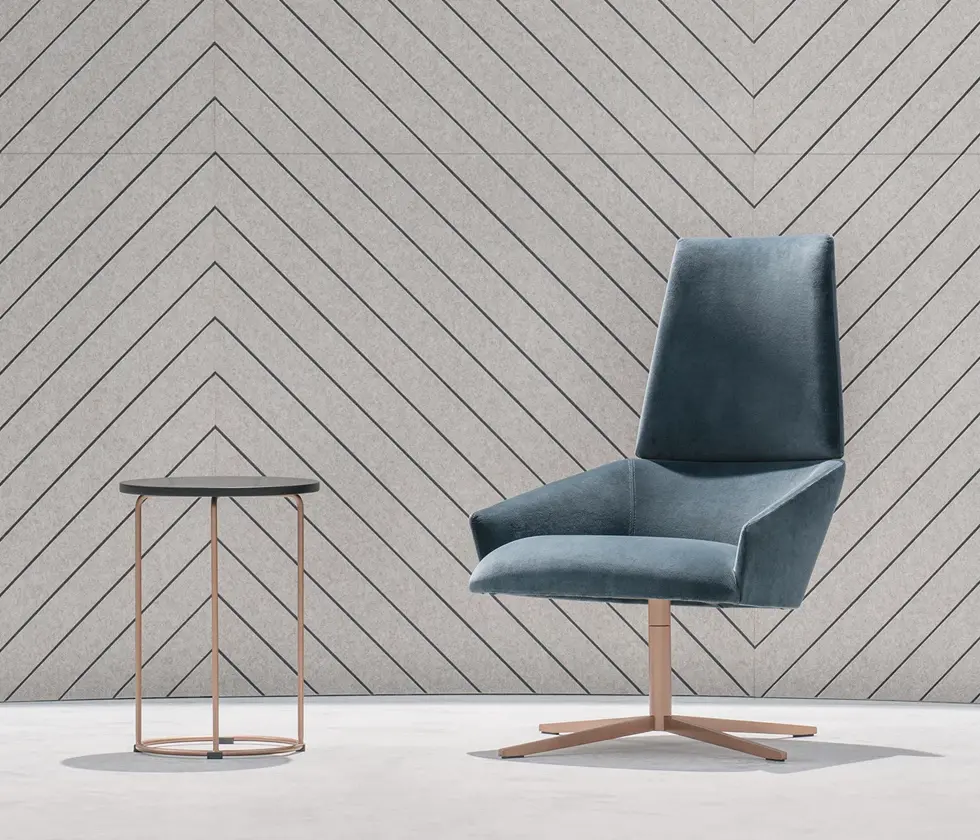 With a design of sophisticated, stylish and sleek lines, Wall Street chair finds its place in cozy, modern spaces where one can comfortably wait, work or simply relax. The upholstered elements and the different bases can be manufactured in all fabrics and finishes from the deberenn swatch samples. The soft yet assertive look of Wall Street coffee tables makes the collection complete.